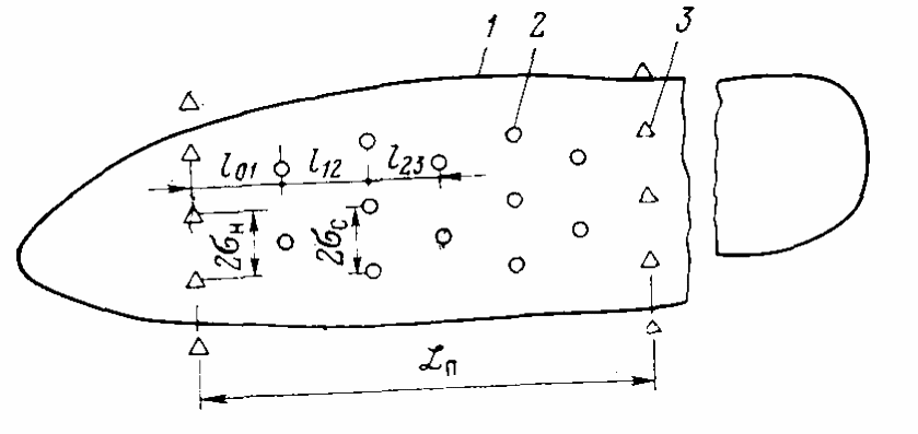 Трехрядная и пятирядная системы .Для трехрядной и пятирядной систем разработки имеет значение не только ширина полосы Lп, но и расстояния между нагнетательными и первым рядом добывающих скважин l01, между первым и вторым рядом доб. скважин l12 (рис. 8), между вторым и третьим рядом доб. скважин для пятирядной системы l2 з (рис. 9). Ширина полосы Lп зависит от числа рядов доб. скважин и расстояния между ними. Если, например, для пятирядной системы l01= l12 = l23=700 м, то Lп = 4,2 км.