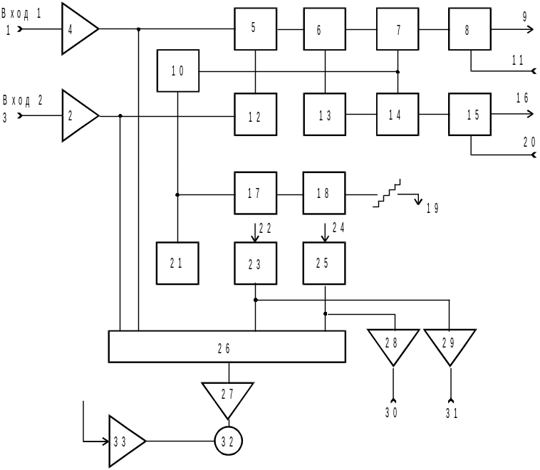 Наличие двух каналов в ЗУ позволяет выделить существенные параметры сигнала, записанного в одном из каналов, и ввести их во второй канал, сократив тем самым объем информации. Исследуемый сигнал одновременно с поступлением в канал вертикального отклонения осциллографа преобразуется в последовательность модулированных по амплитуде импульсов, каждый из которых преобразуется затем с помощью аналого-цифрового преобразователя -6,13 в 9-разрядный двоично-деся-тичный параллельный код. Этот код через систему ключей -7,14 вводится в ЗУ, выполненное в виде девяти регистров на МОП -транзисторах и рассчитанное на хранение тысячи 9-разрядных слов.