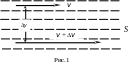 Пусть какой-либо слой жидкости или газа течет со скоростью v (рис.1), а слой, отстоящий от него на расстоянии у, со скоростью v + v. Скорость при переходе от слоя к слою изменяется на величину v. Отношение v/у характеризует быстроту изменения скорости и называется градиентом скорости. При движении плоских слоев сила трения между ними, согласно закону Ньютона,
