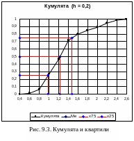 В третьей строке этой таблицы вычислены накопленные частоты m, а в четвертой – значения кумуляты (m / n) на правых краях интервалов.