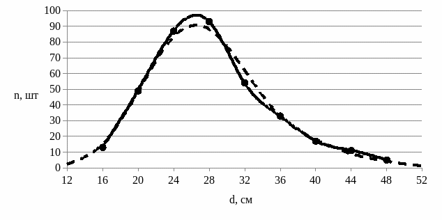 Первоначальный анализ исходных данных показывает, что в древостое распределение деревьев по диаметру носит случайный характер: количество деревьев с малыми и большими значениями диаметра меньше, чем со средними (наиболее заселенными ступенями являются центральные - 24, 28. 32 см). Более наглядное представление о характере распределения деревьев дает график, называемый в статистике полигоном распределения вариант.