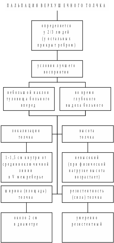 Мякоть концевой фаланги указательного (II) пальца устанавливают перпендикулярно в зоне толчка и постепенно перемещают палец на 0,5 см кнаружи по межреберью (межреберьям). Определяют наиболее латеральную и нижнюю точку, где еще ощущается выпячивание.