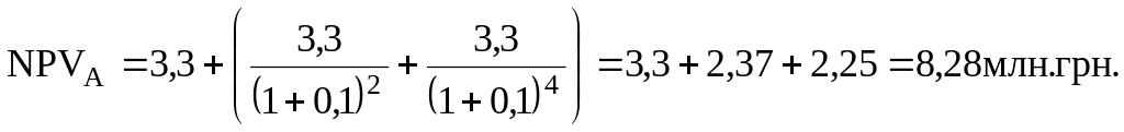Наименьшее общее кратное для срока действия проектов j равно 6. В течение зтого периода проект А может быть повторен трижды, а проекты Б, В - дважды. Попарно анализируются проекты А и Б. Суммарный NPVА в случае трехкратного повторения равен: