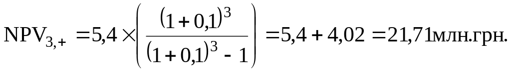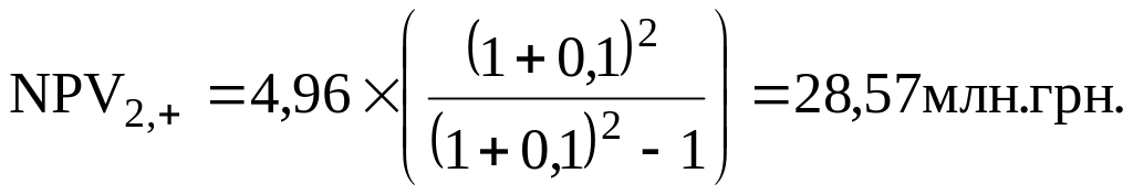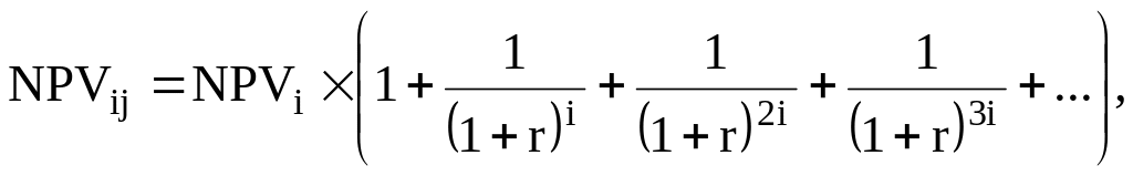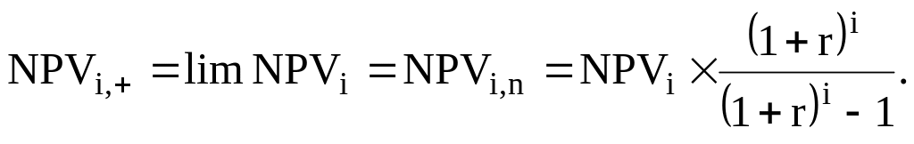 При анализе десятков проектов, отличающихся по длительности их действия, требуется значительное время для расчетов. Однако расчеты можно упростить, предположив, что каждый из анализируемых проектов реализован неограниченное число раз. В этом случае число слагаемых в формуле расчета NPVi,n будет стремиться к бесконечности, а значение NPVi,+ может быть найдено по формуле для бесконечно убывающей геометрической прогрессии: