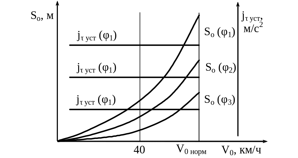 На графике (рисунок 2.1) отметить величины остановочного пути и установившегося замедления при = 40 км/ч и сравнить с нормативными значениями.