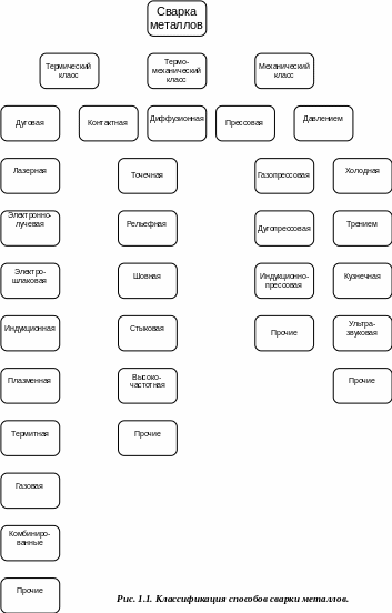 В зависимости от вида энергии, применяемой при сварке металлов, различают три класса сварки: термический, термомеханический и механический. Вид источника энергии, непосредственно применяемого для образования сварного соединения, определяет вид сварки (см. рис. 1.1).