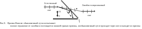 Выходящие из кристалла плоскополяризованные лучи обычно близки друг к другу. Для того, чтобы их «развести», используют различные кристаллические поляризаторы. Наиболее распространенным из них является призма Николя (рис.9).