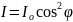 Интенсивность I линейно поляризованного света после прохождения через анализатор зависит от угла φ между плоскостью поляризации падающей световой волны и плоскостью пропускания анализатора. Она определяется по закону Малюса: