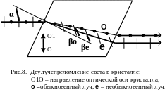 Если на кристалл под некоторым углом α падает естественный свет, то в кристалле, как правило, возникает две волны, линейно поляризованные во взаимно перпендикулярных плоскостях. Им соответствуют два луча. Один из них принято называть обыкновенным лучом (о), второй – необыкновенный (e) (рис.8).