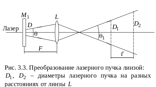 Угловая расходимость лазерного пучка – это угол между его крайними лучами (рис. 3.3). Так как этот угол мал, то непосредственно его измерять трудно. Поэтому сначала пучок пропускают через короткофокусную линзу, уширяют и тогда измеряют расходимость 1 преобразованного пучка. Чтобы определить угол расходимости исходного пучка, нужно рассчитать его по формуле [1]: