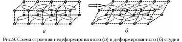 Студни могут содержать до 99% растворителя, при этом они обладают определённой формой и не подвергаются течению. Для студней характерно явление обратимой эластической деформации, происходящей под действием незначительных напряжений (рис.9 б).
