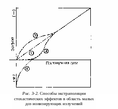 К настоящему времени известна вероятность заболевания раком при получении человеком поглощенной дозы в 1 Гр. Известно также, что радиационный риск при полном отсутствии облучения равен нулю. Однако мало что известно о действии промежуточных доз, поэтому следует попытаться экстраполировать известные оценки риска при больших дозах облучения на область малых доз.