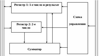 Схема управления принимают по кодовым шинам инструкций управляющие сигналы от устройства управления и преобразуют их в сигналы для управления работой регистров и сумматора АЛУ.
