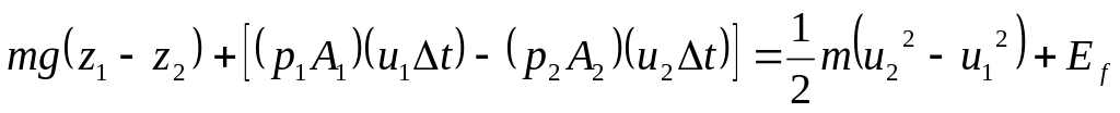 Сила р1*А1 совершает работу на расстоянии u1*Δt (аналогично и для р2 *А2), Еf –тепловыделение при трении, t- время.
