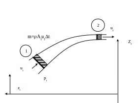 Через сечение 1 втекает масса жидкости m=ρ*A1u1*Δt и столько же жидкости вытекает через сечение 2. Из закона сохранения энергии жидкости следует, что потери потенциальной энергии и работа, совершаемая силами давления, в сумме равны увеличению её кинетической энергии и потерям энергии на трение.