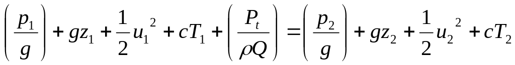 В приёмниках солнечного излучения и в теплообменниках в единицу времени потоку жидкости передаётся от теплового источника энергия Рт. В левую часть (2.1) добавим член, равный количеству переданной тепловой энергии, Е=Рт*Δt. Теплосодержание массы жидкости m с температурой Т1 равно m*c*T1 (c- удельная теплоёмкость жидкости), теплосодержание вытекающей жидкости равно m*c*T2. Теплосодержание объёма изменяется на m*c*(T2-T1). Добавляя этот член в правую часть (2.2), получаем