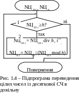 Процес перекладу десяткових чисел розкривається блок-схемами алгоритмів обробки цілих (рис. 1.4) і дробових (рис. 1.5) чисел. У операційному блоці 2 (рис. 1.4) відбите цілочисельне ділення (div) і приєднання до результату (символ конкатенації – | ) залишків від ділення (mod).