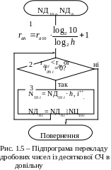 На рис. 1.5 в блоці 1 визначається необхідна кількість розрядів дробового результату з урахуванням подальшого округлення, тобто на одиницю більше. У блоці 3 формується результат за допомогою приєднання (конкатенації) цілих частин добутків.