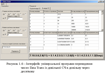 Програма розкриває процес формування результату переведення цілої й дробової частин числа (рис. 1.6). Вона містить у собі також універсальний модуль округлення результату з урахуванням точності переведення в довільній системі числення.
