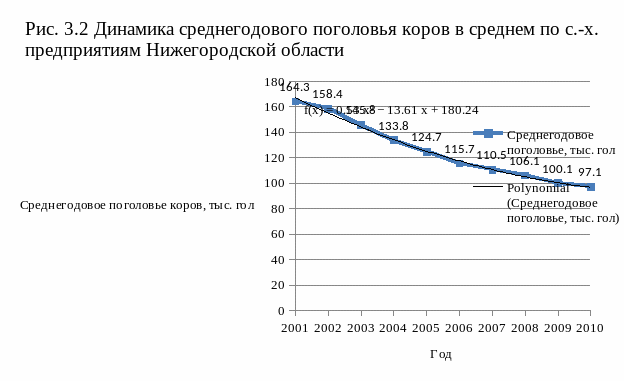 Полученные уравнения свидетельствуют о том, что ежегодно в среднем полголовье коров в хозяйстве изменилось на 0,2803x2 - 5,5439x гол., а в Нижегородской области на 0,5271x2 - 13,614x тыс. гол.