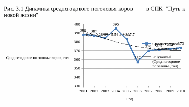 В этой связи следует отметить, что в целом по России в последние годы в хозяйствах всех категорий сохранилась тенденция сокращения численности крупного рогатого скота. Так, на конец 2010 года по сравнению с тем же периодом 2006 года поголовье крупного рогатого скота в целом по России уменьшилось на 3,4%, коров - на 4%. В СПК «Путь к новой жизни» наблюдалась несколько иная тенденция в изменении поголовья коров.