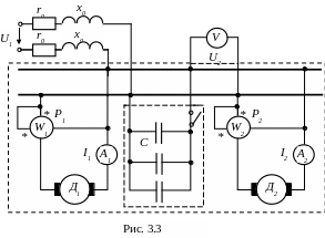 ЗАДАЧА 3.4. Два электродвигателя переменного тока подключены параллельно к сети с напряжением U2 и работают с низким коэффициентом мощности. Измерительные приборы в цепи каждого электродвигателя показывают токи I1 и I2, мощности Р1 и Р2 (рис. 3.3).