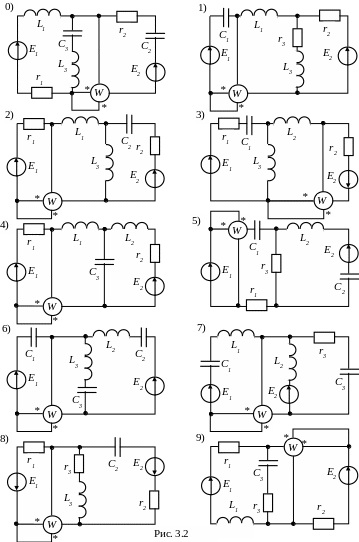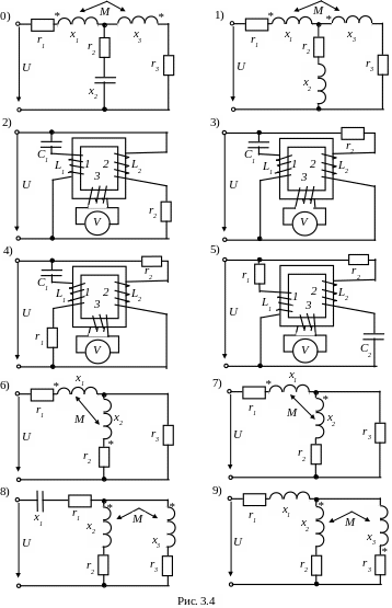 ЗАДАЧА 3.5. На рис. 3.4 изображена схема электрической цепи, содержащая индуктивно связанные обмотки (третья обмотка в схемах 4-5-6-7 замкнута на вольтметр с очень большим сопротивлением, током которого можно пренебречь).