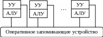 Архитектура с параллельными процессорами. Здесь несколько АЛУ работают под управлением одного УУ. Это означает, что множество данных может обрабатываться по одной программе — то есть по одному потоку команд. Высокое быстродействие такой архитектуры можно получить только на задачах, в которых одинаковые вычислительные операции выполняются одновременно на различных однотипных наборах данных. Структура таких компьютеров представлена на рис. 6.