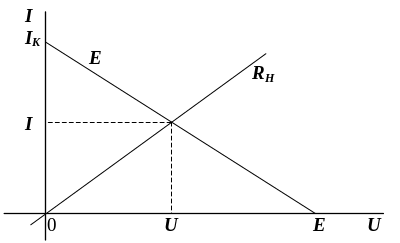 Ток общей нагрузки I зависит от сопротивления нагрузки RH, эквивалентной ЭДС