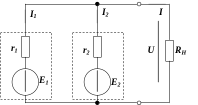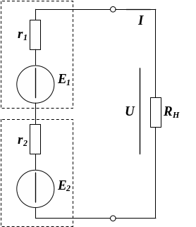 При подключении в цепь с последовательно соединенными источниками напряжения нагрузки RH возникает ток, определяемый как
