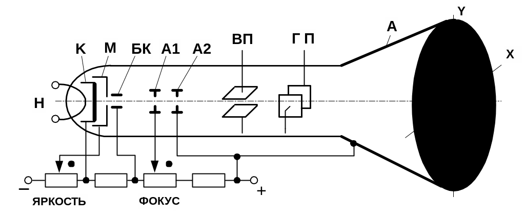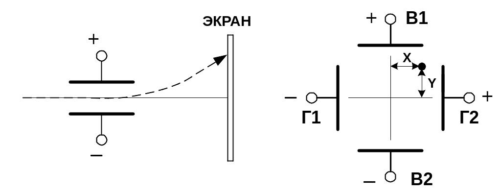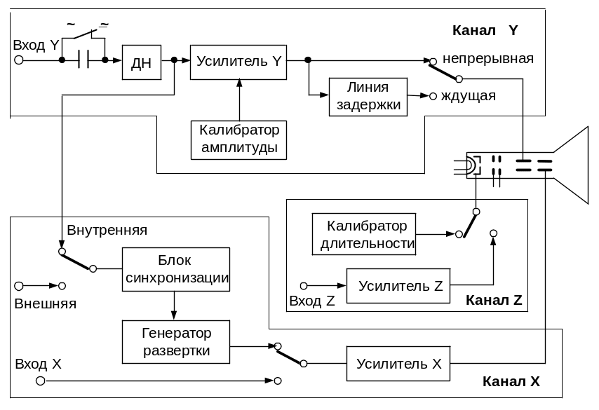Двухканальные ЭЛО: два канала вертикального отклонения Y1 и Y2 и высокочастотный коммутатор, поочередно подключающий каналы к пластинам Y.