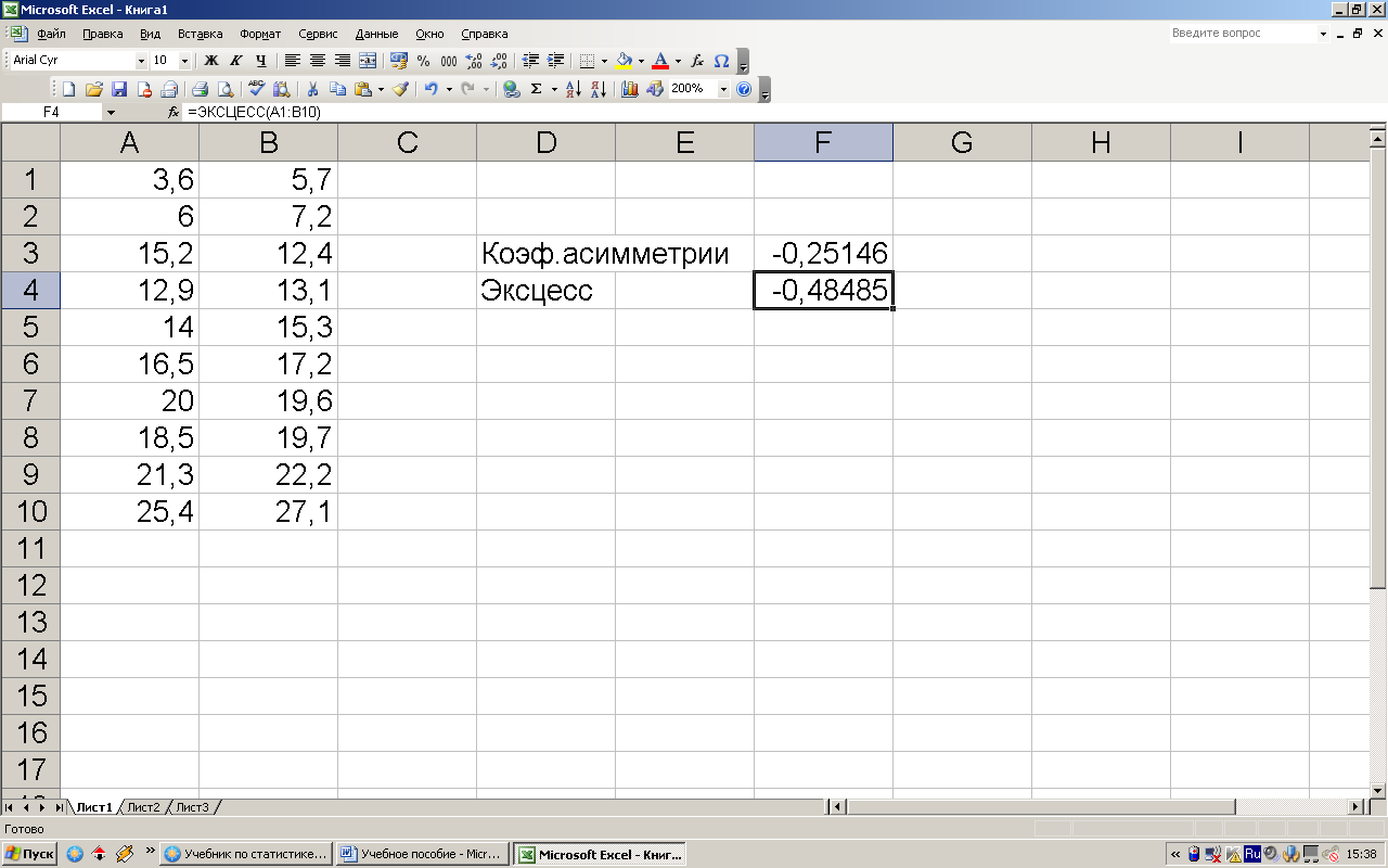 Упражнение 1.10.4. С помощью функций СКОС и ЭКСЦЕСС в Excel вычислите коэффициент асимметрии и эксцесс по данным примера 1.5.1. Сформулируйте выводы.