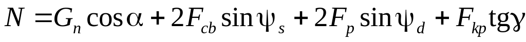 где ‑ угол уклона поверхности пути; s и d ‑ углы наклона передней и задней ветвей гусеницы; Fcb ‑ натяжение в свободной ветви гусеницы, Н; Fp ‑ усилие в рабочей ветви гусеницы, Н; ‑ угол отклонения крюковой нагрузки в вертикальной плоскости.
