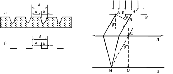 Дифракционная решётка представляет собой совокупность большого числа параллельных равноотстоящих друг от друга одинаковых щелей. Расстояние d между одноимёнными краями двух соседних щелей называется периодом или постоянной решётки. Как видно из рис. 1, а d = a+b, где a – ширина щели, b – ширина промежутка между щелями.