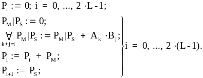 Основная проблема при формировании общих ключей Диффи и Хеллмана заключается в реализации произведений сомножителей большой разрядности (более 32-х бит). Рассмотрим метод формирования произведения сомножителей большой разрядности (m – разрядность сомножителей; L – количество 32-х битных слов каждом в сомножителе) на основе команд умножения 32-х битных сомножителей.