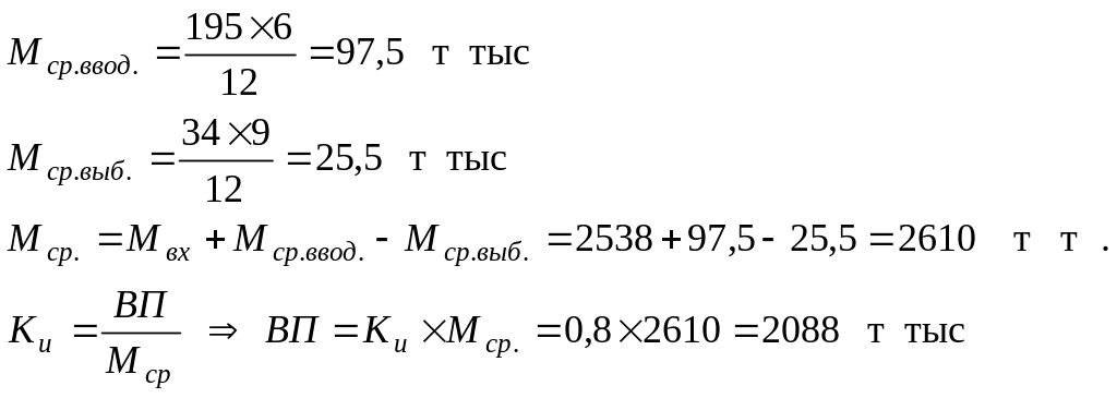 В краткосрочном периоде производственная мощность является постоянной, а в долгосрочном – может изменяться за счет вывода и ввода оборудования. В связи с этим различают входную, выходную и среднегодовую мощность. Входная – мощность на начало периода (отчетного или планируемого). Выходная – мощность на конец периода. Среднегодовая мощность рассчитывается по формуле: