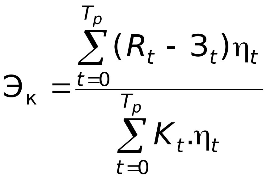 Индекс рентабельности инвестиций Эк определяется как отношение суммы приведенной разности результата и затрат к величине капитальных вложений. Если капитальные вложения осуществляются за многолетний период, то они также должны браться в виде приведенной суммы. В общем случае индекс рентабельности инвестиционных вложений определяется зависимостью