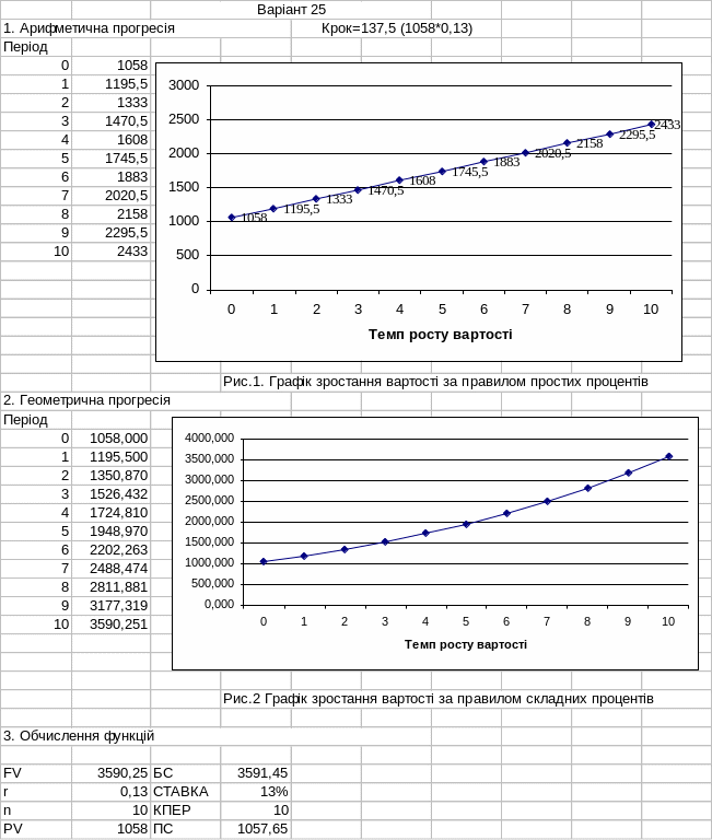 Хід виконання роботи. Згідно наведеної форми спочатку визначається майбутня вартість початкової суми за методикою простих відсотків: вводиться у комірки кількість періодів згідно варіанту та початкова сума. Потім визначається крок прогресії: Початкова вартість * ставку відсотку. Виділити, починаючи з початкової вартості і до кінця періодів, комірки. Далі необхідно зайти до меню ПРАВКА→Заполнить→Прогрессия→по столбцам→шаг→ арифметична прогресія. Згідно отриманого результату за допомогою майстра діаграм будується графік.