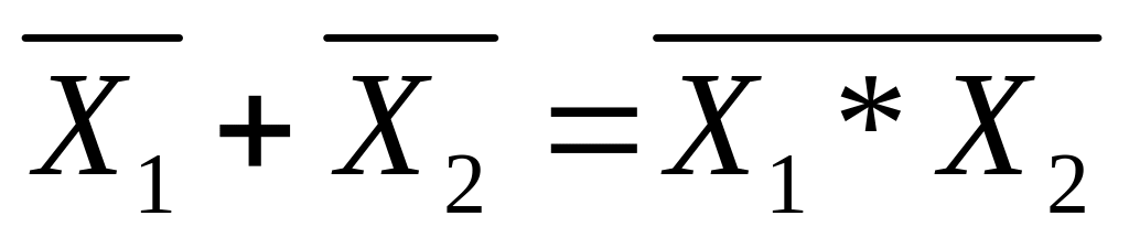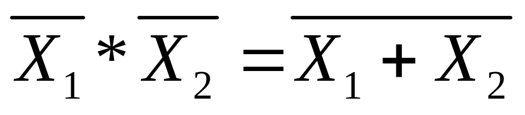 Смысл первой формулы заключается в том, что если отсутствуют первый Х1 и второй Х2 сигналы (операция логического умножения отсутствующих сигналов), то операция переходит в логическое «2ИЛИ-НЕ», т.е. на выходе отсутствует сигнал, так как нет Х1 или Х2 (по сути дела, их нет обоих).