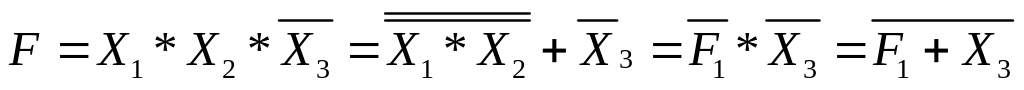 Смысл второй формулы состоит в том, что если нет сигнала Х1 или Х2 (операция логического сложения отсутствующих сигналов), то операция переходит в «2И-НЕ», т.е. на выходе нет сигнала, так как нет Х1 и нет Х2.