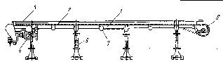 Остов транспортера представляет собой раму, состоящую из отдельных звеньев, выполненных из двух продольных швеллеров, которые соединены между собой стяжками и уголками. К швеллерам прикреплены продольные металлические планки, служащие направляющими при движении бутылки.