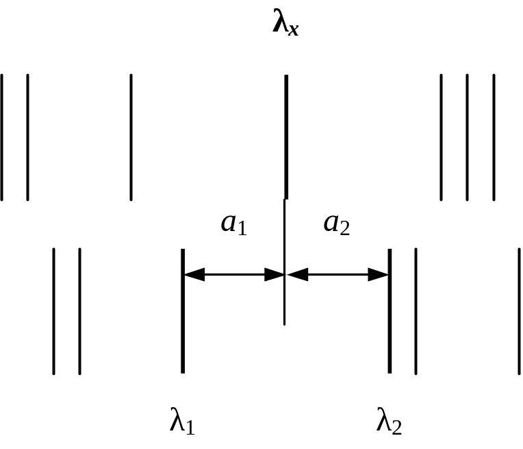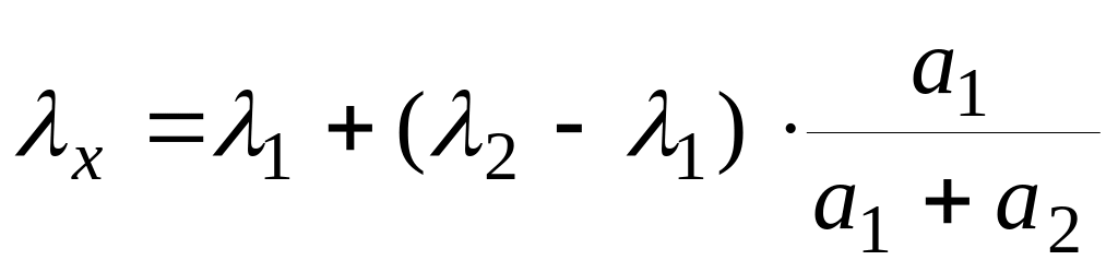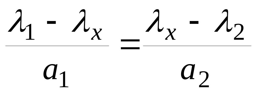3. Метод лінійної інтерполяції. Для точнішого визначення довжини хвилі при фотографічному фіксуванні спектра на одну пластинку фотографують спектр об'єкту аналізу і поруч спектр заліза. У спектрі заліза вибирають дві лінії (λ1 i λ2), між якими розташована лінія невідомого елемента (λx). З допомогою спеціального вимірювального мікроскопа вимірюють відстані а1 і а2 між лінією невідомого елемента і лініями заліза: