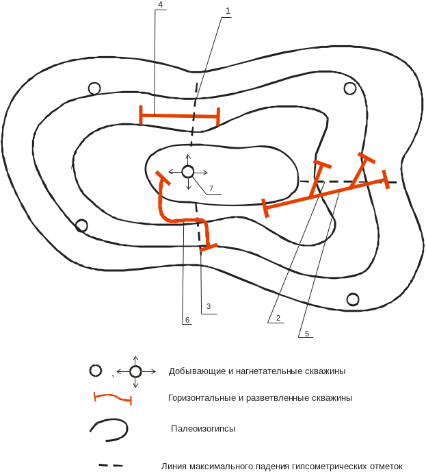 Поставленная задача достигается описываемым способом, включающим бурение добывающих и нагнетательных вертикальных и горизонтальных скважин, закачку воды через нагнетательные и отбор продукции через добывающие скважины. Новым является то, что определяют зоны максимального падения гипсометрических отметок, в этих зонах дополнительно бурят горизонтальные и/или разветвленные горизонтальные скважины, причем горизонтальные стволы скважин и/или горизонтальные разветвления размещают в продуктивном пласте субпараллельно изогипсам палеоструктурной поверхности, и в процессе бурения периодически изменяют траекторию ствола скважины для поиска макро- и мегатрещин и/или карстовых пустот, выбирают добывающую скважину, имеющую наименьший дебит в ряду, равноудаленном от рядов нагнетательных скважин и переводят ее в нагнетательную, и в процессе бурения периодически меняют траекторию ствола скважины (рисунок 5.12). При бурении горизонтальных и/или разветвленных горизонтальных скважин ведут поиск макро - и мегатрещин и/или карстовых пустот путем изменения траектории горизонтальных и/или субгоризонтальных разветвлений стволов горизонтальных скважин.