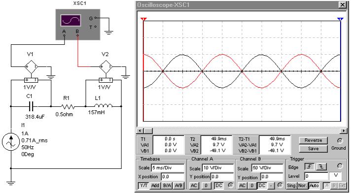 Аналогом дифференциальных усилителей в Multisim являются зависимые источники напряжения, управляемые напряжением ИНУН). На рис. 4 показаны схема и осциллограммы для измерения сдвига фазы между напряжениями на конденсаторе и катушке индуктивности.