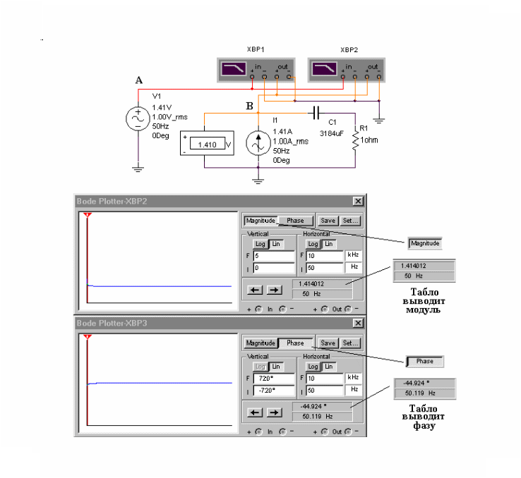 Если установить Боде-плоттер ХВР1 в режим Magnitude, а Боде-плоттер ХВР2 в режим Phase, то на их табло будут выведены значения модуля и фазы комплекса напряжения.