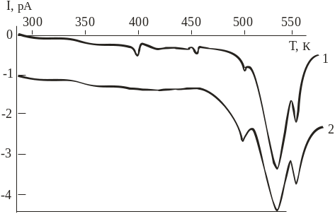 Рисунок 1.78 – Спектры ТСТ кремня, подвергнутого механическому измельчению после 1 часа экспозиции на воздухе (1) и после 1 года экспозиции (2)