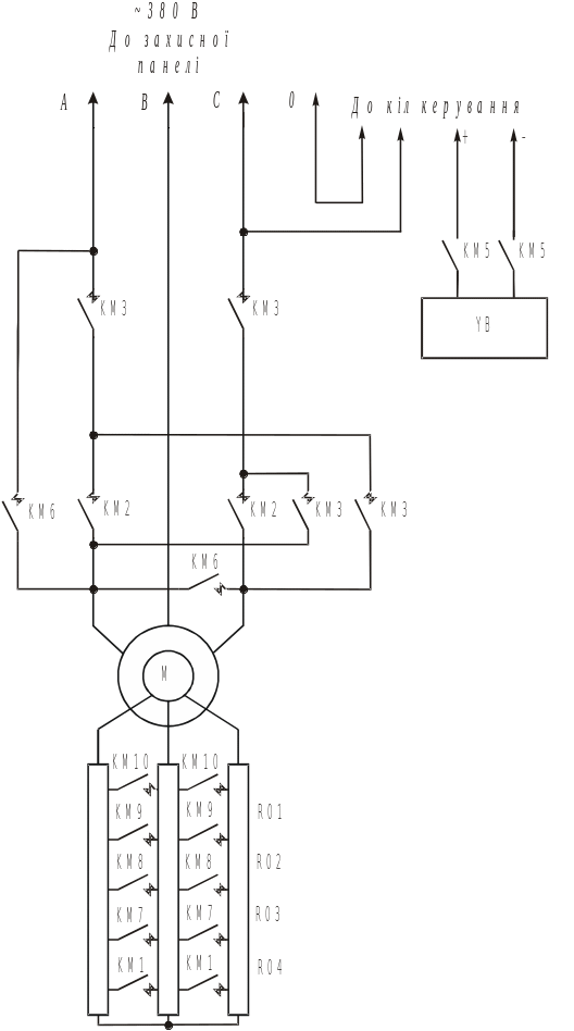 У пояснювальній записці потрібно навести розроблену принципову електричну схему керування (силові кола та кола керування). Схему треба виконати з дотриманням вимог діючих стандартів, вона повинна відповідати кількості пускових ступенів (див. рис. 9 і рис. 10).