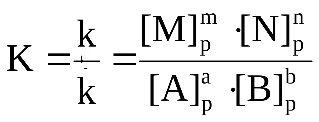 где K - константа равновесия (величина постоянная для данной температуры); [A]p, [B]p, [M]p и [N]p – равновесные молярные концентрации веществ A, B, M, и N; a, b, m, n – стехиометрические коэффициенты.