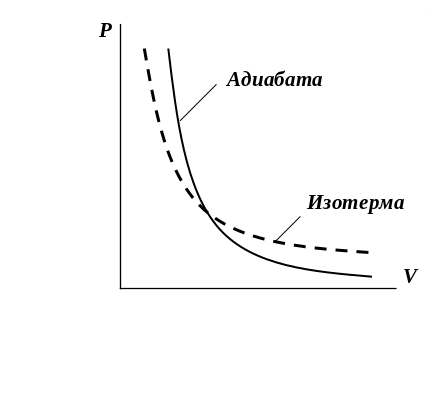 Более крутое падение давления с увеличением объёма при адиабатном процессе объясняется тем, что при адиабатном расширении идеального газа его давление уменьшается не только за счёт увеличения объёма, но и вследствие происходящего при этом понижения температуры газа. Чем меньше коэффициент Пуассона γ, тем адиабата ближе к изотерме. В пределе, когда γ стремится к единице, адиабата переходит в изотерму. Рассмотренные выше изотермический и адиабатный процессы являются идеализированными.