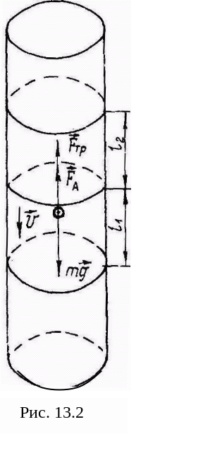Кроме силы трения Fтр на тело, движущееся в жидкости (рис. 13.2), действуют сила тяжести mg и сила Архимеда FA. Будем считать движение установившимся (v = const). Тогда уравнение движения шарика в проекции на направление движения имеет вид